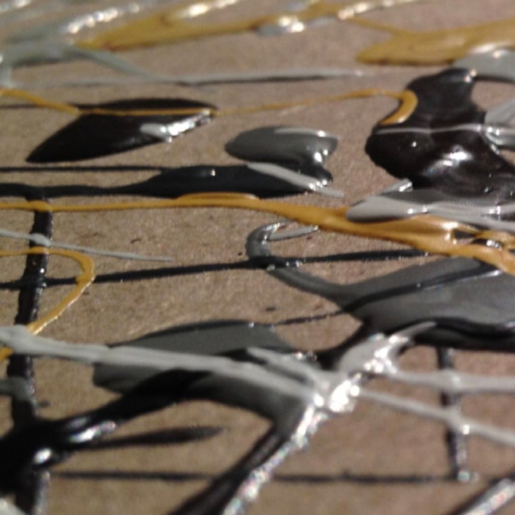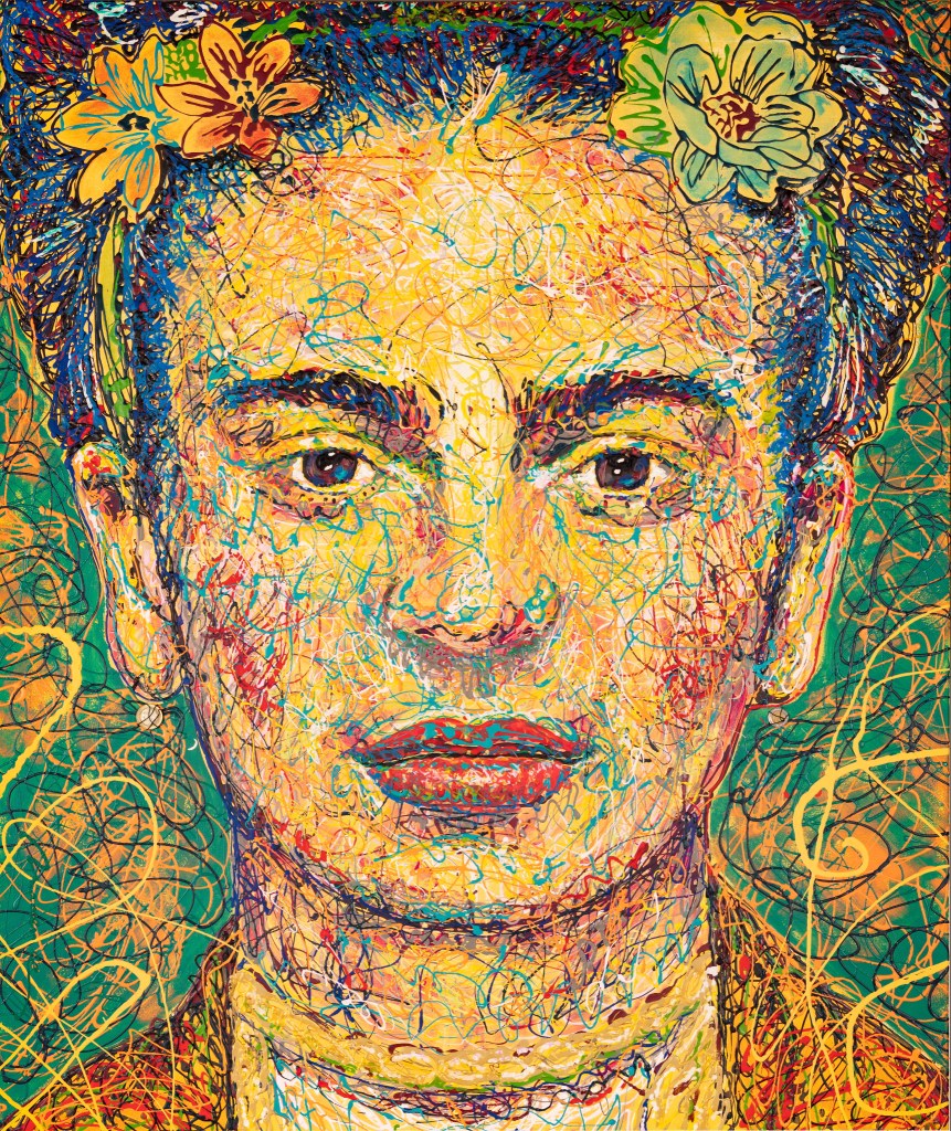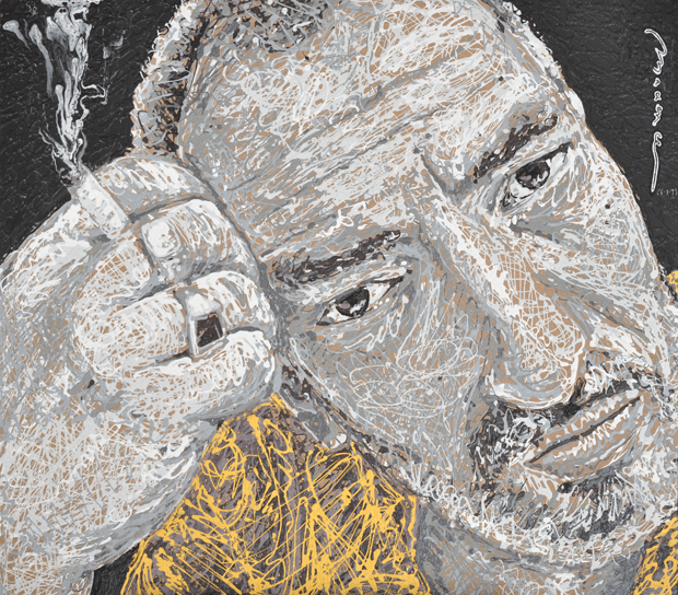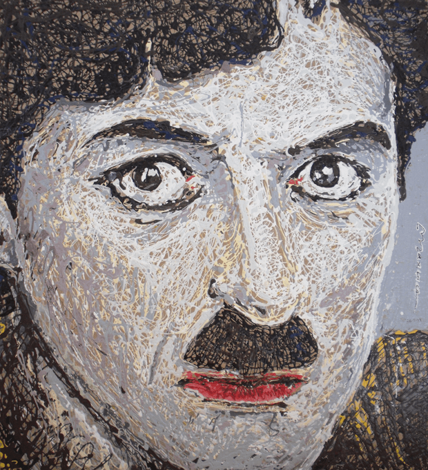 Neuf kilos de peintures tout en nuances entrecroisées, d’où l’aspect filament rappelant le maquillage épais du personnage Charlot.