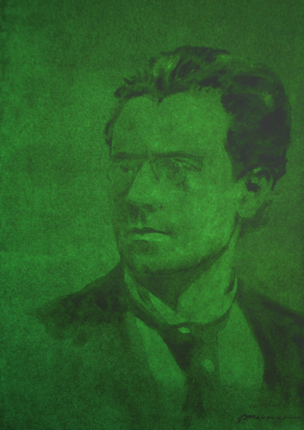On ne voit presque rien. Sur la toile écrue, des aplats de blanc suggèrent vaguement la forme d’un visage. Mais qu’on fasse l’obscurité dans la pièce, puis qu’on balaye cette toile d’une lumière blanche, et le visage du compositeur autrichien Gustave Mahler apparaît aussitôt par phosphorescence dans toute la force de son expression.