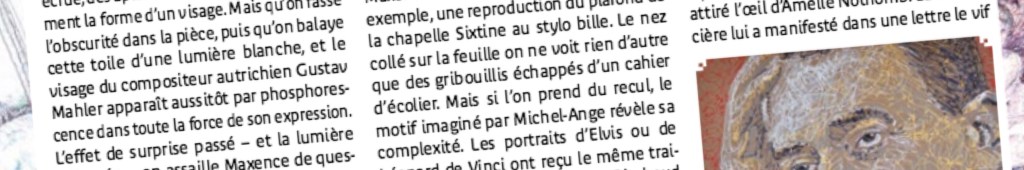 Les portraits d’Elvis ou de Léonard de Vinci ont reçu le même traitement. Ceux de Mozart et de Rimbaud sont faits de notes et de portées musicales pour le premier, de voyelles et de consonnes pour le second. A la manière des calligrammes d’Apollinaire. Ce qu’on voit n’est pas ce qu’on regarde, et c’est pourtant la même chose.
