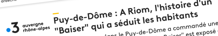 - A Riom, l’histoire d’un « Baiser » qui a séduit les habitantsStéphanie VINOT, France 3 Auvergne Rhône-Alpes. 10.11.2021 La ville deLire la suite « A Riom, l’histoire d’un « Baiser » qui a séduit les habitants »